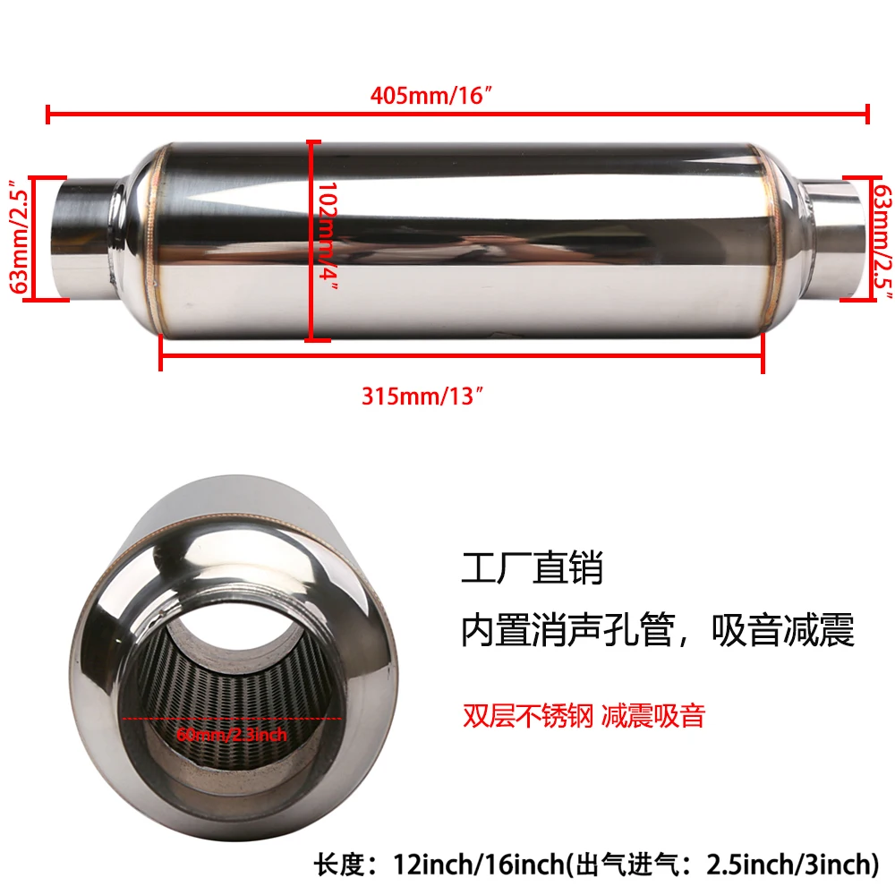 16" Length Stainless Steel Exhaust Resonator Universal 2.5"/3" Inlet Deep Sound