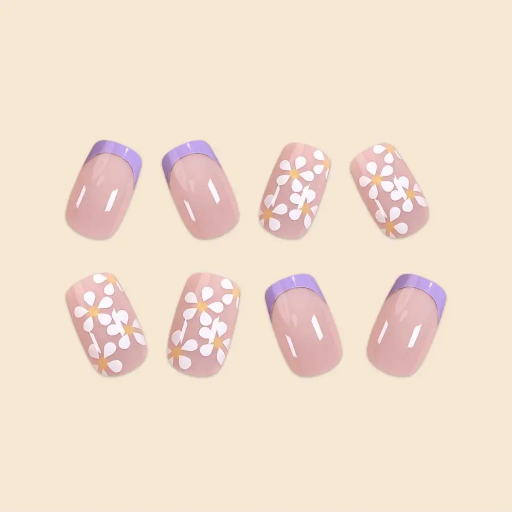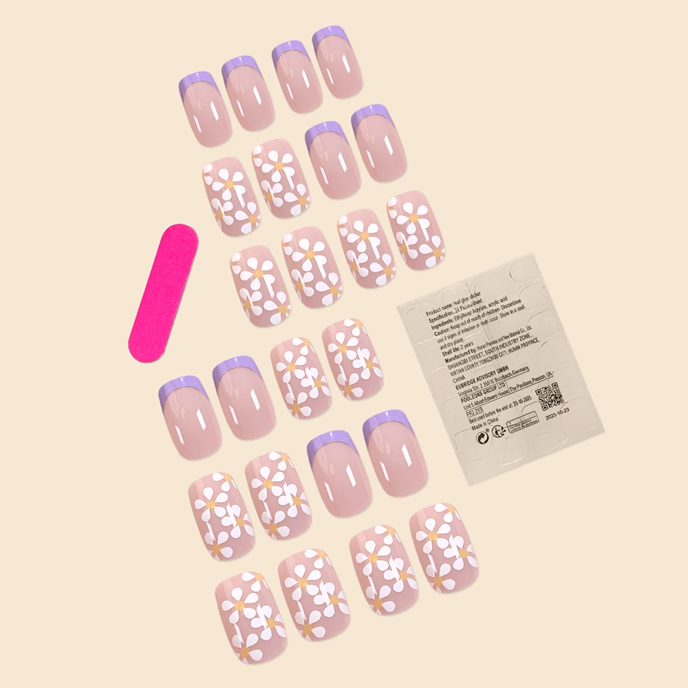 24Pcs/Set Women Middle Size Purple Border French White Flowers Powder Full Cover