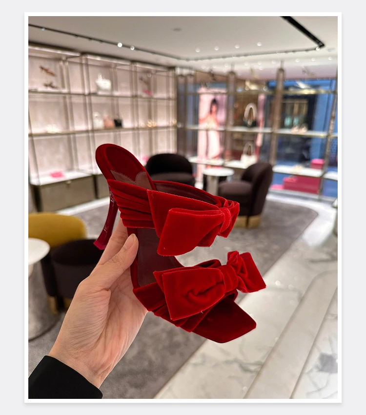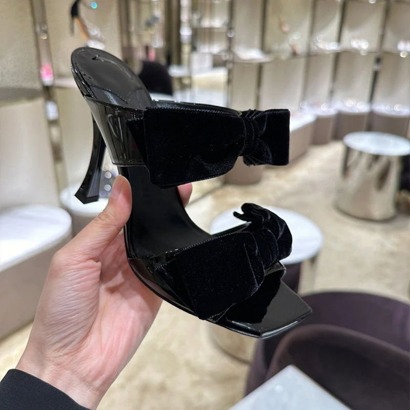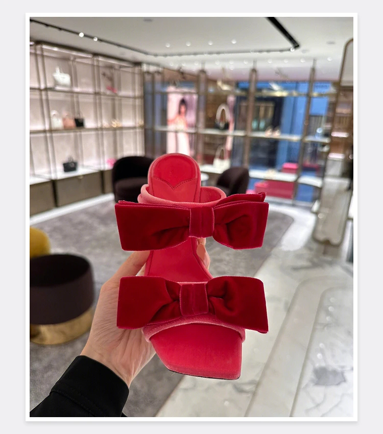 Bow Sugar Pink Pile Sandals 2024 New Lady Sandals Square Toe Open Toe Stiletto B