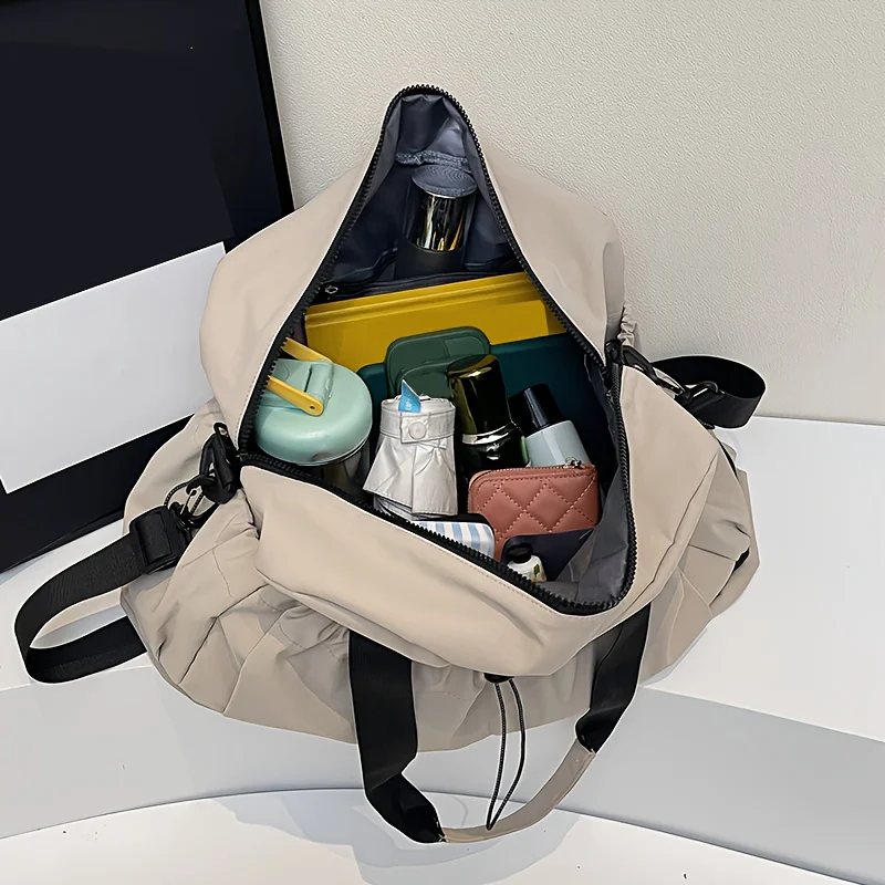 Travel Duffel Bag - Your Ideal Travel & Fitness Companion1. Product OverviewMeet the Sports Duffel Bag – a perfect blend of style, functionality, and durability. Designed for modern lifestyles, it suits gym sessions, short trips, or daily commutes. Lightweight yet spacious, it keeps your essentials organized with ease.2. Key Features① Spacious & Organized StorageLarge Main Compartment: Holds workout clothes, shoes, towels, or travel essentialsSmart Pockets:Front quick-access pocket for small items (keys, cards).Side zippered pocket for water bottles or umbrellas.Inner mesh pocket for toiletries or electronics.② Durable & Lightweight MaterialCrafted from high-quality nylon fabric – water-resistant, tear-resistant, and easy to clean. Weighs only 0.8kg, so it won’t add extra burden during your travels or workouts.③ Versatile Carrying OptionsDual Carrying Modes:Sturdy top handles for hand-carrying.Adjustable, detachable shoulder strap for cross-body or shoulder wear.Comfort-focused design: Thickened straps reduce shoulder pressure, even when fully loaded.④ Stylish AestheticMinimalist beige + black accents = effortless style for gym, travel, or daily use. The “GUOMISS” logo adds a touch of sophistication.⑤ Thoughtful DetailsShoe Compartment: Separates dirty shoes/clothes from clean items (zippered side access).Secure Closure: Smooth zippers and reinforced stitching ensure long-lasting use.