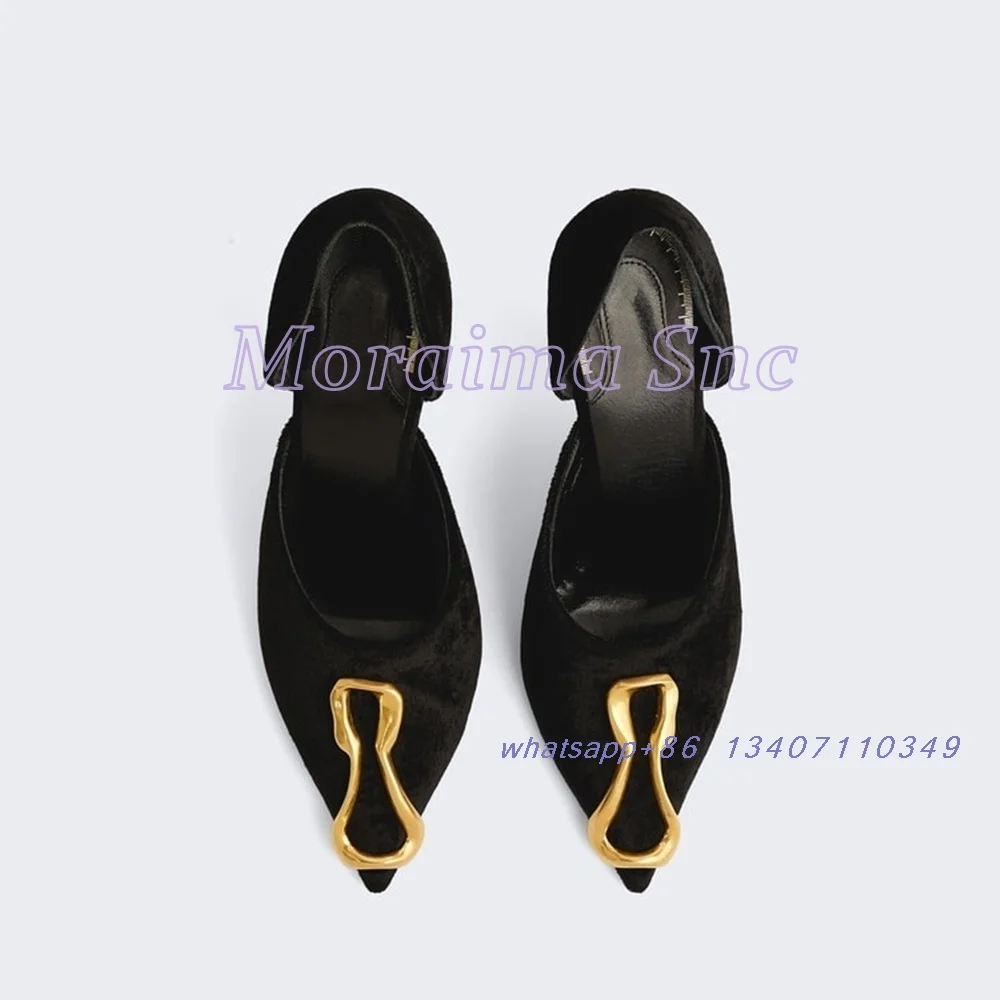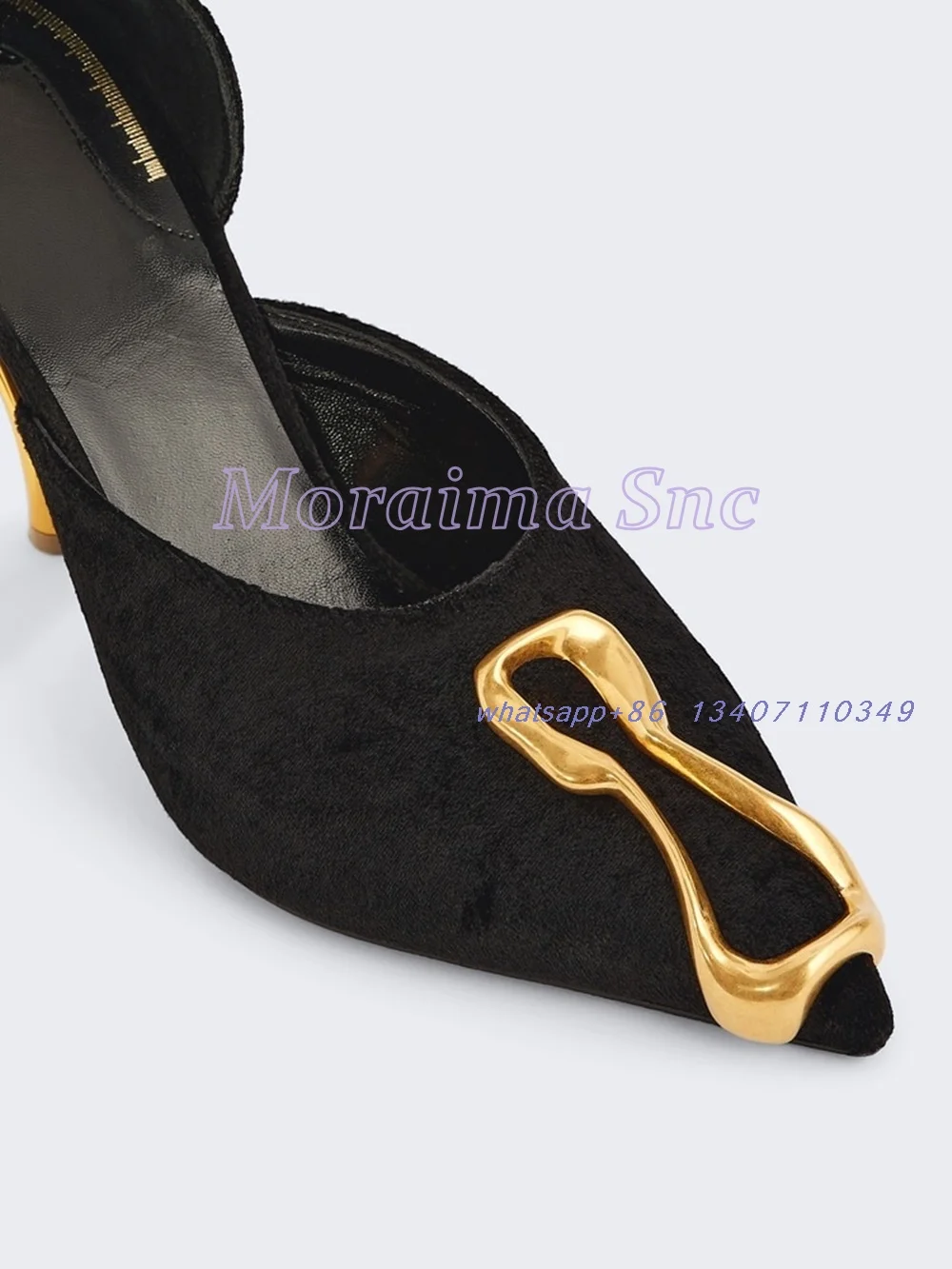 Metal Decor Pointed Toe Sandals Strange Heel Slip On Shallow Black Solid Sexy Fa