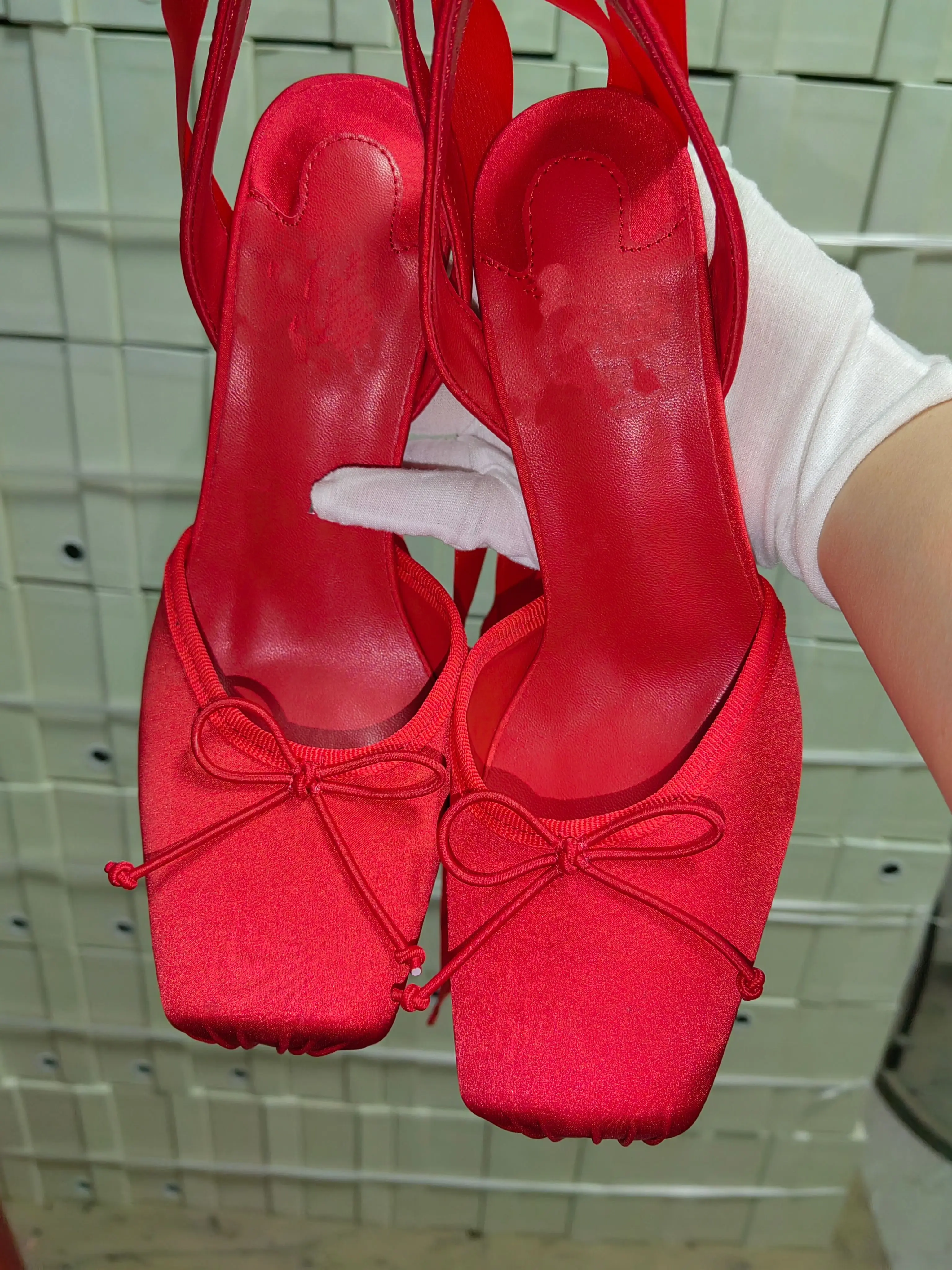 New ballet red soled high heels satin ribbon French bow women's shoes rose red c