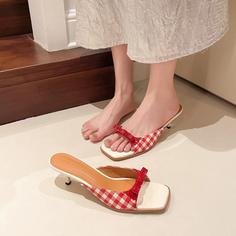 Sweet White Red Plaid Mule Sandals Woman Fairy Bowknot Kitten Heel Slide Slipper