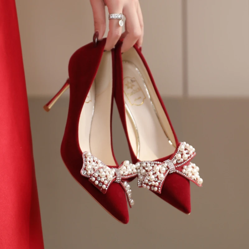 Women's High Heels Summer New Pointy Bow Pearl Suede Wedding Shoes Fashion Tempe